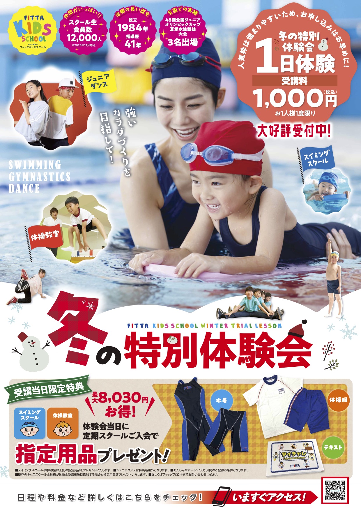 大好評のキッズスクール冬の特別体験会を開催!スイミング・体操教室・ジュニアダンス・空手の4種目を開講!!体験料は税込1,000円!予約枠に限りがありますのでお早めのご予約をおすすめします!また、体験会受講後に定期スクールへご入会の場合はお得な特典をご用意しておりますので、この機会をお見逃しなく!!