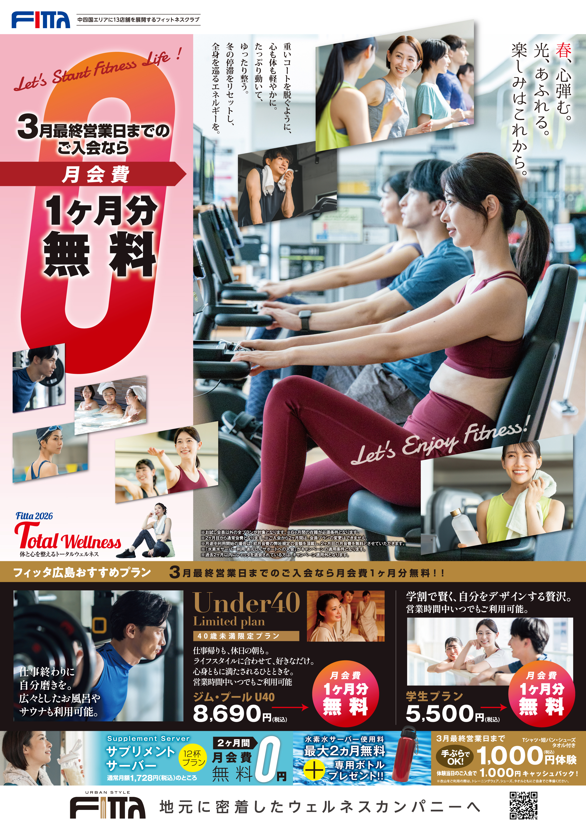 2026年3月の入会キャンペーン実施中!3月最終営業日までにご入会手続きをいただくと、1ヶ月分の月会費が0円!!!さらに、水素水は2ヶ月間飲み放題、サプリメントサーバー(12杯プラン)も2ヶ月間0円!!!