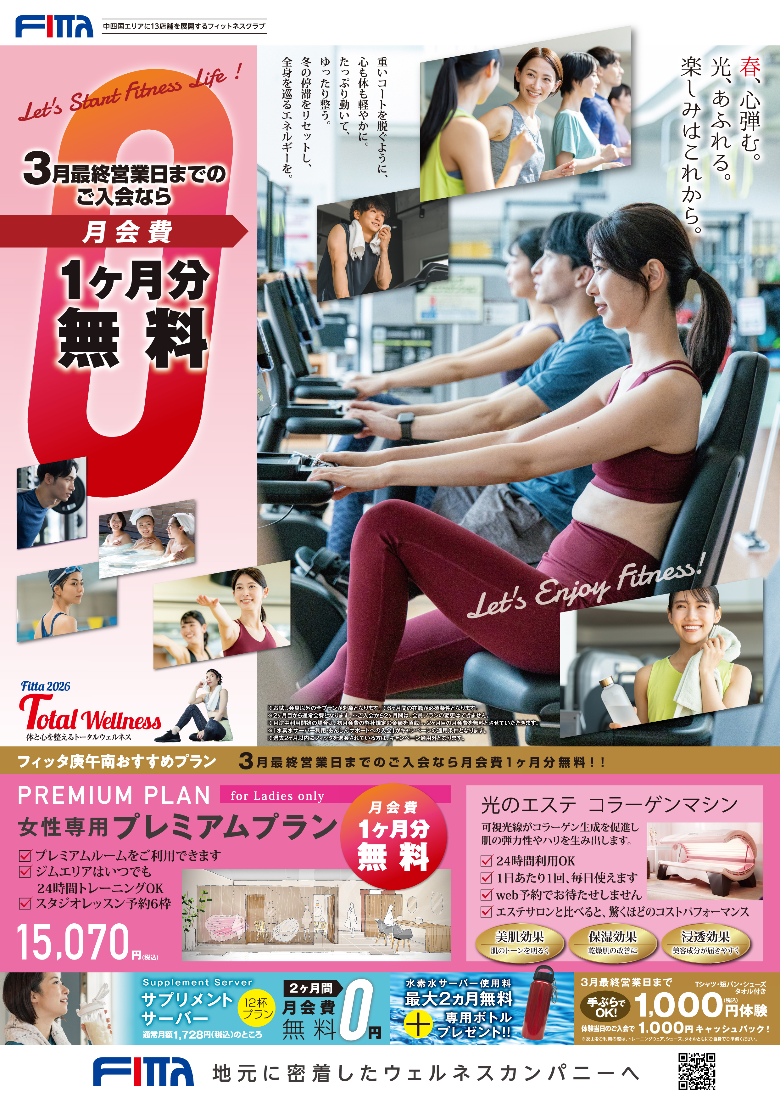 2026年3月の入会キャンペーン実施中!3月最終営業日までにご入会手続きをいただくと、1ヶ月分の月会費が0円!!!さらに、水素水は2ヶ月間飲み放題、サプリメントサーバー(12杯プラン)も2ヶ月間0円!!!