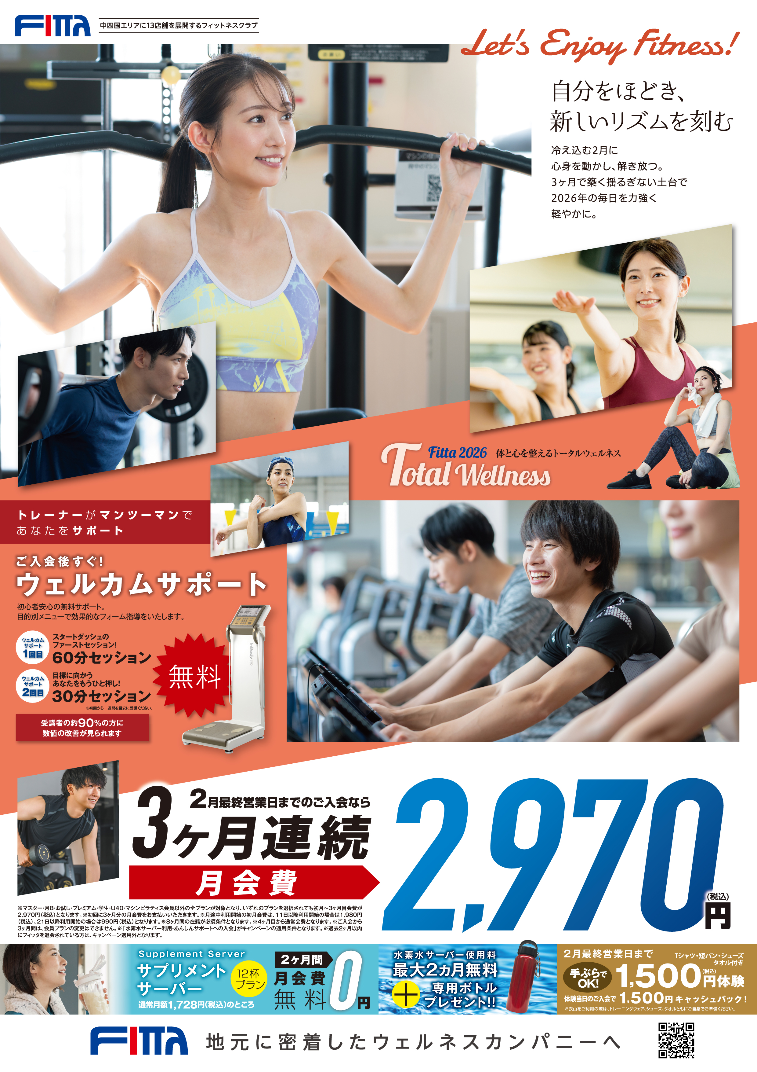 2026年2月の入会キャンペーン実施中!2月28日(土)までにご入会手続きをいただくと、3ヶ月連続で月会費がなんと2,970円(税込)!!!さらに、水素水は2ヶ月間飲み放題、サプリメントサーバー(12杯プラン)も2ヶ月間無料!!!